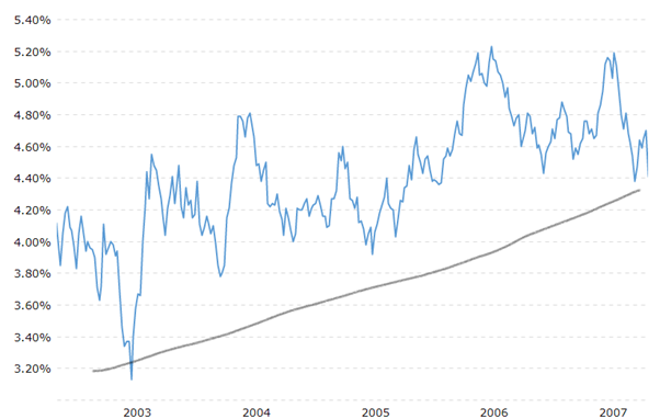 The first noticeable period would be during the economic boom pre-GFC where the US 10Y yield rose from a low of 3.2% in 2003 to a high of 5.2% in 2007, whereas gold in USD terms still managed to rise from under $400 per ounce to over $650 in the same time frame.