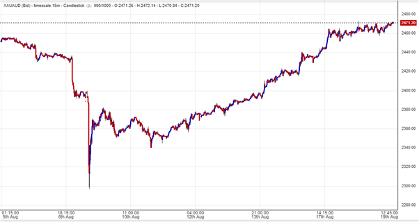 The gold price in AUD terms has added $170 per ounce since the intraday low of $2,300 on the 9th of August, potentially catching many off guard. We covered the probable reasons behind the flash crash in last week’s update in depth, and one of the potential causes could have been a strategic trade by one or more large entities coordinating to trigger a stop loss cascade during a time where the environment was perfect to do so. If that was the case, it seems quite obvious the objective was to then go long the yellow metal after the forced liquidation. But we can only speculate based on what the price action tells us: