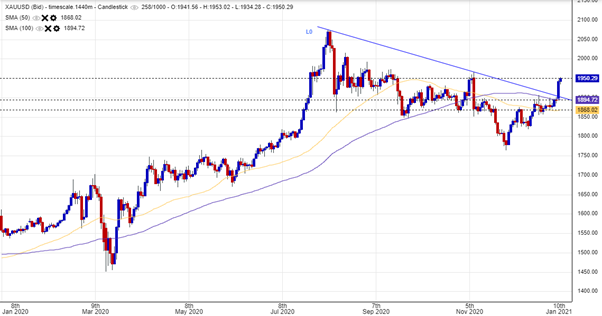 After putting in a significant low on the 30th of Nov 2020 at USD $1,765, investors were wondering how long the pullback and consolidation phase for gold would be before the next leg higher. December has been a seasonally weak month for previous metals over the past five years so it is interesting to see metals making a January recovery once again as we start 2021. One key indication that the current profit taking environment for gold is over, is the key breakout above the downtrend line off the recent highs. We can see in the chart above as soon as gold managed to clear the downtrend line from the August peak, the market experienced a spike of buyers stepping in with the price reacting quite quickly, sending gold to $1,950 once again. This clearing of the recent downtrend would give bulls confidence that the structural bull market is ready to continue and the weaker hands were likely knocked off during the November sell-off.