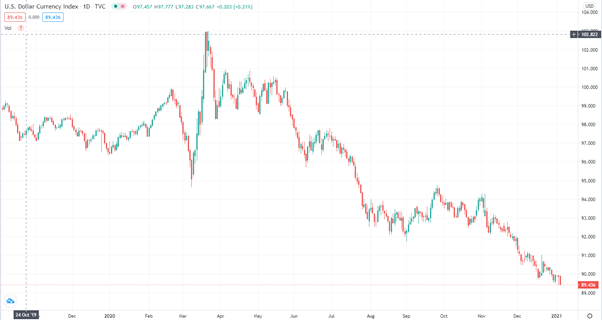 One of the major trends of 2020 was severe USD weakness. The US Dollar index fell from a high of 103 in March 2020 to 90 in December, over 12% lower. We saw a huge expansion of the money supply in the US in 2020 and odds are this trend of USD weakness is set to continue into 2021, as the index has failed to hold any key support levels thus far. The USD Index can be seen in the chart below and it looks like a falling knife scenario.
