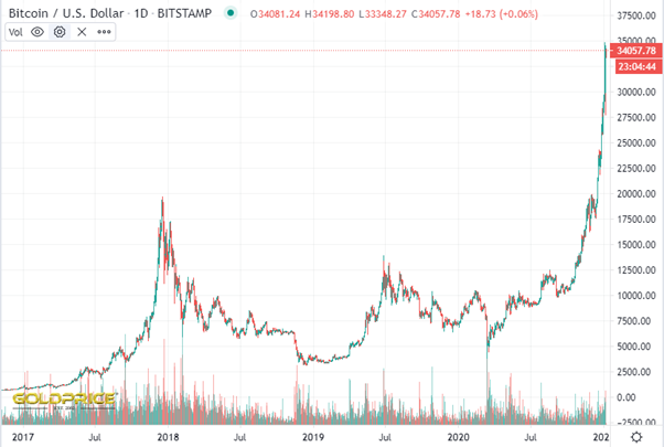 It’s not only gold and silver starting the year with a bang, as most punters would have seen bitcoin breaking out into new all-time highs. As soon as bitcoin broke through the key USD$21,000 mark it was a quick trip to $34,000 per coin with a parabolic spike largely driven by FOMO and potentially assisted by the infamous Tether printer.
