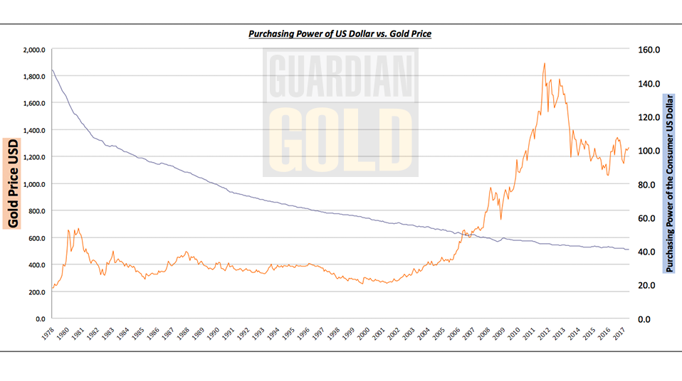 Source – (1) U.S. Bureau of Labor Statistics, Consumer Price Index for All Urban Consumers: Purchasing Power of the Consumer Dollar, retrieved from FRED, Federal Reserve Bank of St. Louis, (2) World Gold Council
