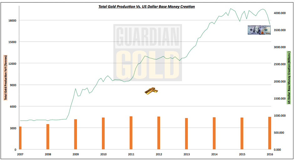 The below chart is a snapshot of the growth of the US base money over the last decade vs. the annual supply of new gold produced through mining, scraping / recycling.