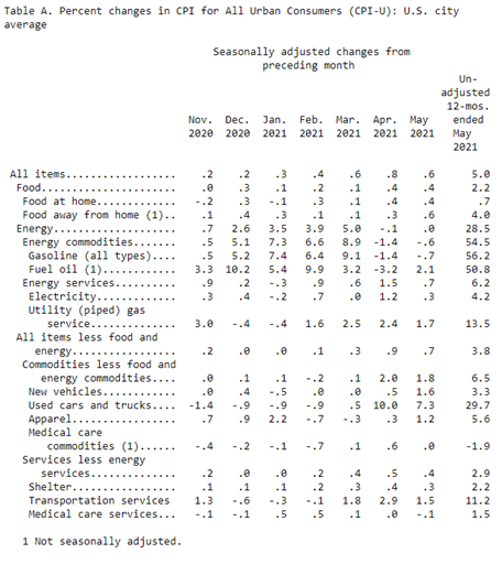 Whilst everyone will be focused on the headline inflation number of 5%, there is another way to look deeper into the numbers. Bianco Research notes that the combined 2% jump in core CPI over the past three months marks the fastest rise since 1982, and is actually equivalent to an 8.3% annual growth rate. But due to coming off such a low base in previous months it will be very interesting to see next month’s number, as the argument by the Fed thus far has been that inflation is ‘transitory’ and nothing to worry about. Please note that the Federal Reserve does not have the best track record for forecasting, so you can take their inflation forecasts with a grain of salt.
