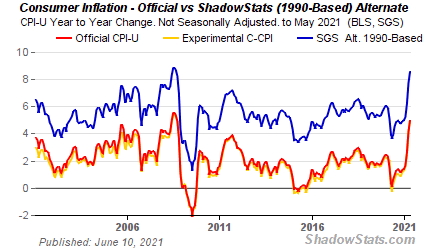 This week saw the release of US CPI data for the month of May, and after April’s surprise CPI print of an annualized 4%, we saw inflation continue to trend higher in the US with the official numbers coming in above expectations yet again at 5% on an annualized basis, the highest since August 2008. Gold’s reaction was somewhat sluggish, rising 0.5% on the day, as the market seems unconvinced that the inflation genie has been let out the bottle just yet. In this weeks update we look at alternative measures on inflation which could explain why the official CPI numbers have been so low despite the rapid expansion in global money supplies.